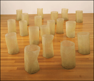 the first of three encountered pieces of work that have a resounding impact on the viewing public. It stops one in one's tracks: how dare it be there - this mess of nothing! It is like arranged chaos: that is, the confused mixture of varying sizes of rope, dipped in latex, looks as though it might collapse in a heap on the floor at any moment. At the same time, it is held up and in place by a series of fine wires and hooks, giving it a strange sense of ... order. A deliberate challenge to the forces of gravity. It is a shambles. It makes one laugh. It is play. It is drawing in the air! Maybe it can move or dance about! Yet, it is hardly there, like something imagined. The materials are cheap and disposable. Impermanent, like ... the people looking at it. But it is very definitely present! It has a presence. You can see that people want to walk into it and become a part of it - but alas! The gallery guard is hovering nearby. ![]()